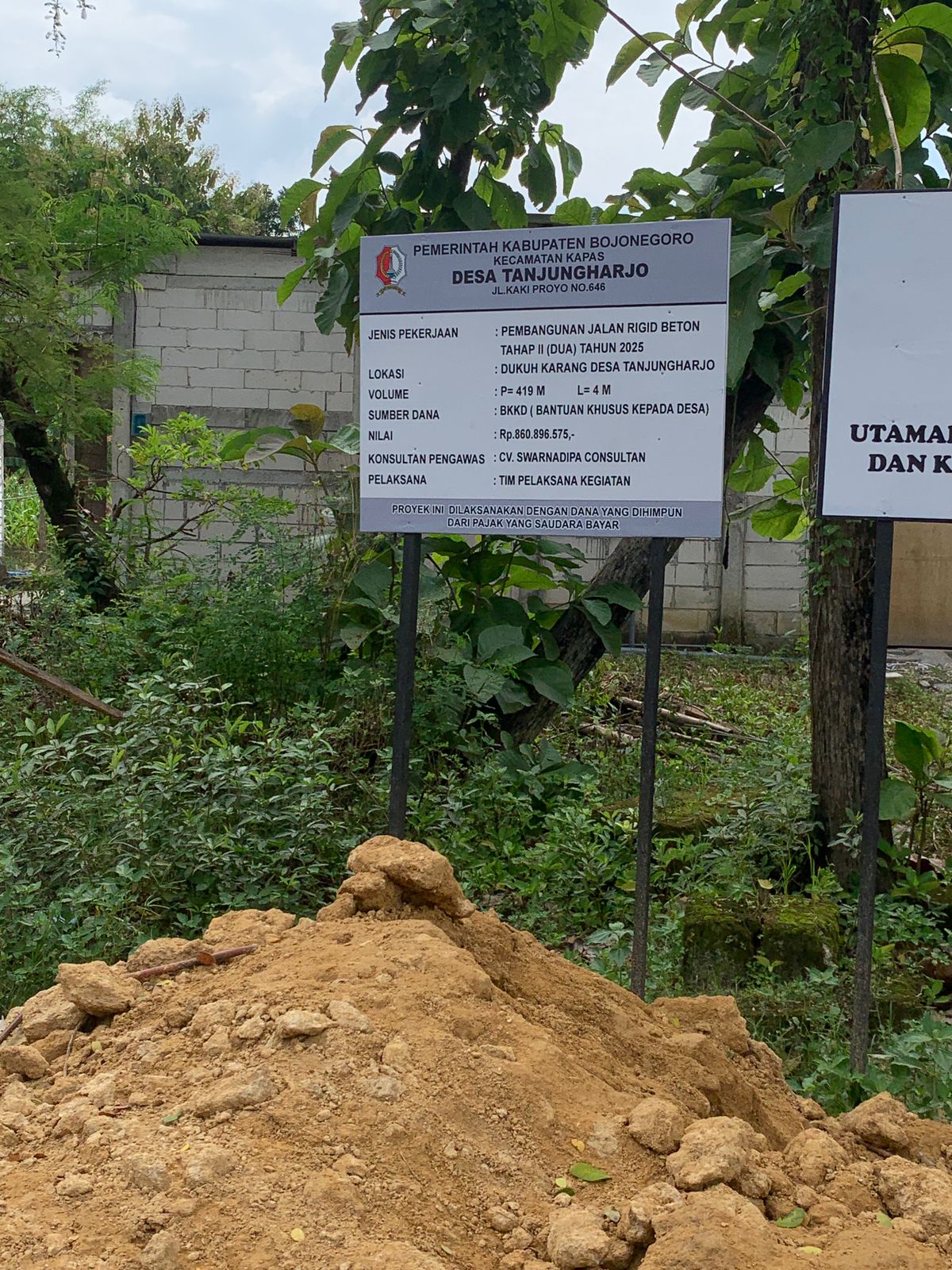 Bojonegoro – Pembangunan jalan rigid beton di Desa Tanjungharjo, Kecamatan Kapas, Kabupaten Bojonegoro, menuai sorotan. Proyek infrastruktur yang dilaksanakan dalam dua tahap pada tahun anggaran 2025 itu diduga tidak sesuai dengan spesifikasi volume sebagaimana tercantum dalam papan informasi kegiatan.