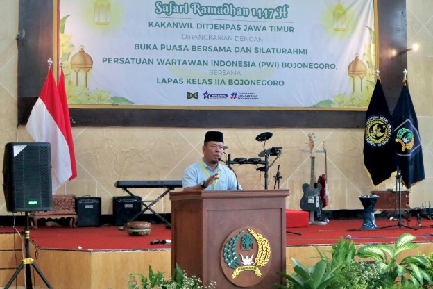 Bojonegoro | MMC – Kegiatan Safari Ramadhan Kepala Kantor Wilayah Direktorat Jenderal Pemasyarakatan (Ditjenpas) Jawa Timur berlangsung hangat di Aula Lapas Kelas IIA Bojonegoro, Kamis sore. Kegiatan ini juga dirangkaikan dengan silaturahmi antara Persatuan Wartawan Indonesia (PWI) Kabupaten Bojonegoro bersama jajaran Lapas Bojonegoro.